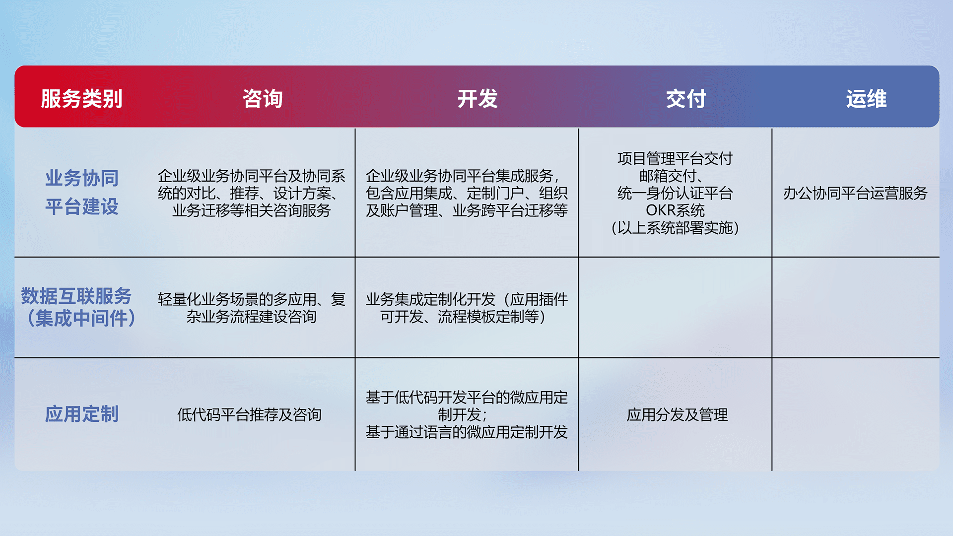 针对钉钉、、、、企微、、IDaas等平台级产品提供产品的规划、、方案、、、、交付、、、定制化开发等服务,,,实现如统一协同办公、、智能客户服务、、、混合会议管理、、智能数据查询、、、、等业务场景,,,实现数字化转型。。。