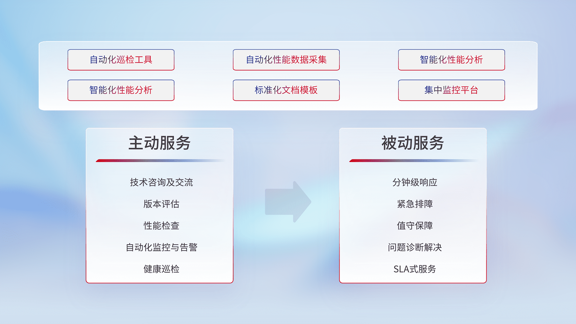 智能化工具和标准化文档,,,保障服务质量,,提供主动服务(包含技术咨询、、版本评估、、、性能检查、、自动化监控与告警、、健康巡检)和被动服务包含(分钟级响应、、、、紧急排障、、值守保障、、、问题诊断解决、、、SLA服务)。。。。