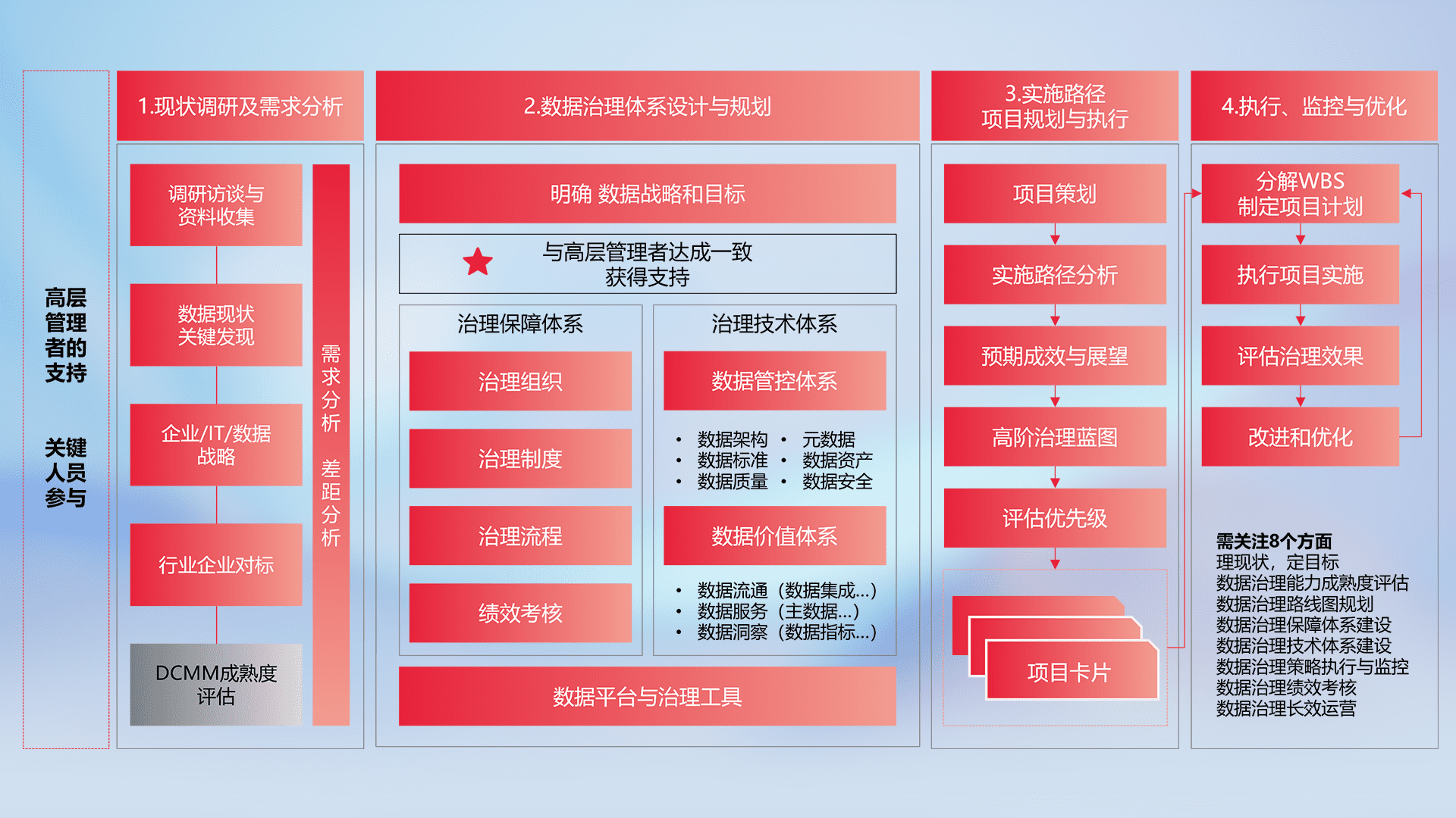 制定并执行统一的数据标准,,,,规范数据定义和格式,,,消除冗余和不一致性,,,实现跨部门和跨系统的数据一致性,,,为企业提供标准化的数据基础。。。。